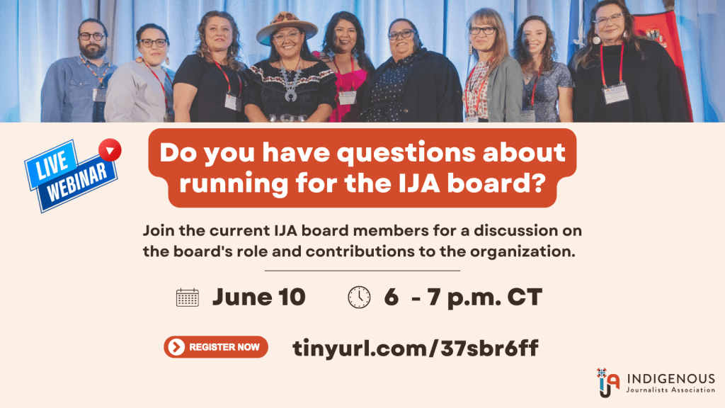 The Indigenous Journalists Association (IJA) will host elections online July 15-25 and in-person July 26. IJA members will elect members of the board of directors and vote on a ballot measure to accept updated bylaws.