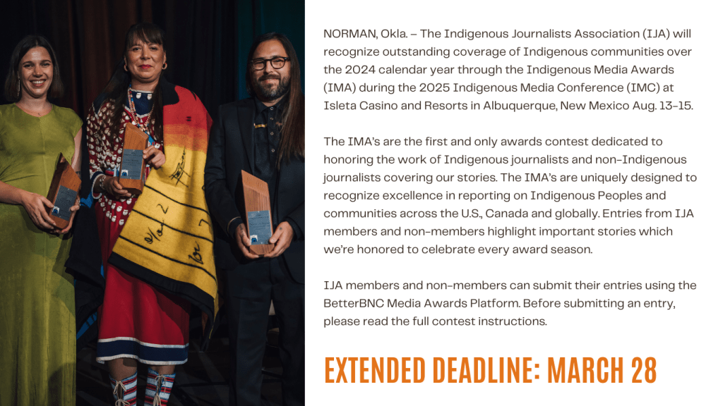 The IJA Elias Boudinot Free Press Award recognizes a publication or media outlet that has shown dedication and commitment to upholding freedom of the press, information and transparency within Indigenous communities. All entrants must be IJA members, however, there is no entry fee for this category and there is no cost to nominate a member for this award. The recipient will be honored during the 2025 Indigenous Media Awards Banquet.