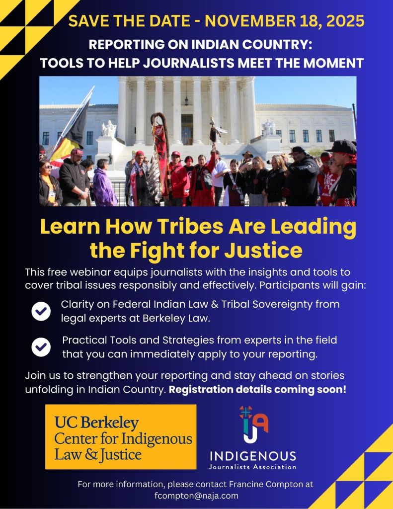 IJA is collaborating with UC-Berkeley, Poynter and Grist to host an upcoming webinar on Nov. 18 that will provide a foundational overview of federal Indian law and responsible reporting practices in Indian Country. The training is open to all journalists.